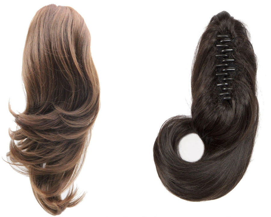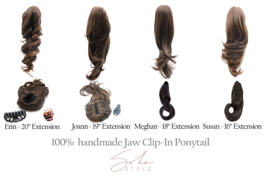Meghan is a natural looking, long layered ponytail. It has a small size claw clip that attaches to the hair. Susan ponytail is the most voluminous clip-on ponytail. It is designed with lots of layers & mega volume! It has a large clip to attach to the hair. Joann is the longest of the three. It consists of long layers, medium volume and a large claw clip to attach to the hair.
