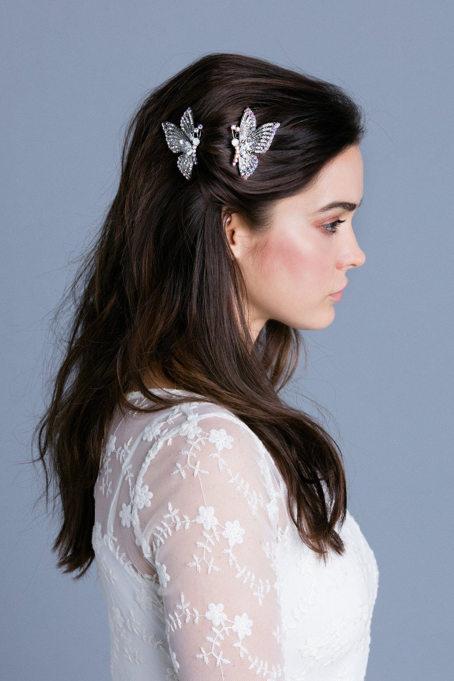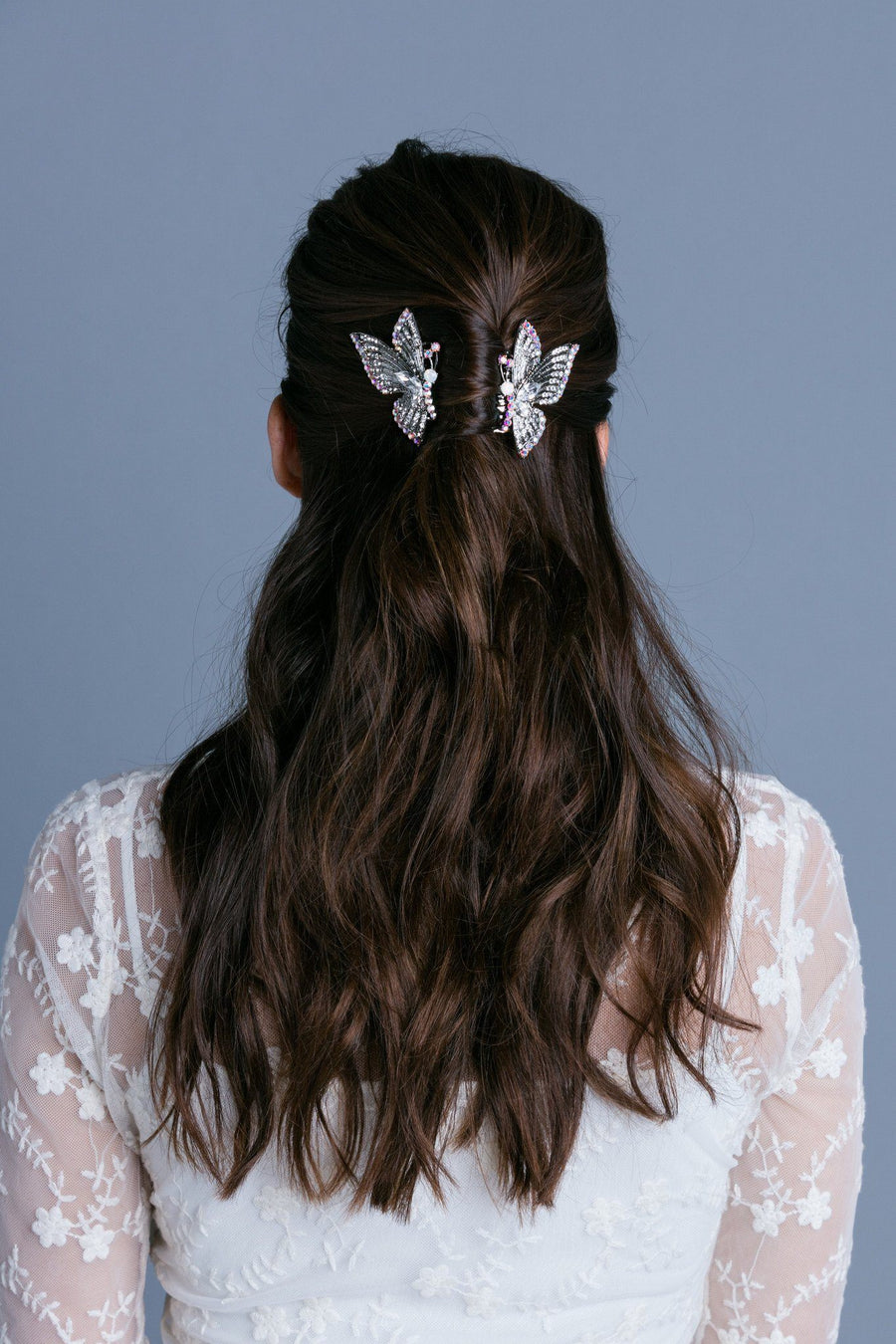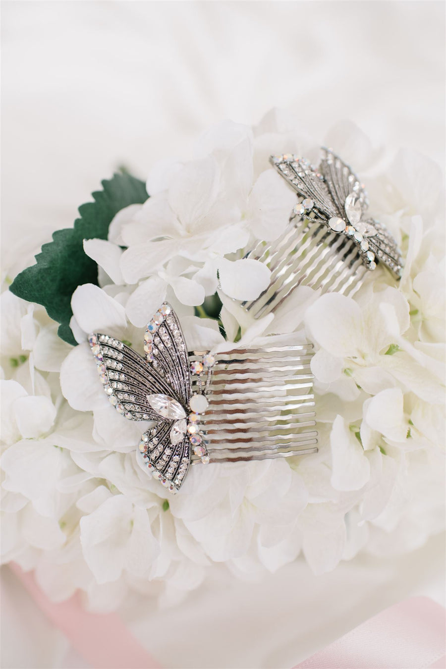 These elegant crystal hair combs lock together creating secure hold for any hair type! Once secured the combs form a unified butterfly look. This is perfect for a half-up hairstyle or around a ponytail!
